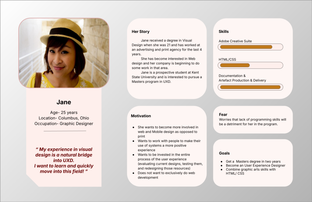 Create a visually compelling and well-organized persona layout for a UXD student at Kent State University (KSU). Academically, the goal was to showcase an understanding of typography, composition, and hierarchy and application of foundational knowledge in human perceptual, cognitive, and physical capabilities, especially regarding reading, attention, and motivation.