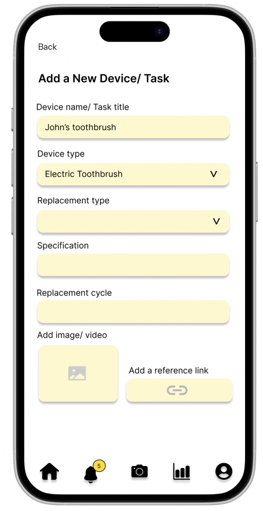 To design a solution that helps individuals and small business owners track and receive timely reminders for replacing household and hygiene-related consumables—like batteries, filters, toothbrushes, razors, and dish pads. The goal was to reduce friction in routine maintenance by providing proactive, context-aware nudges that simplify replacement planning and ensure better upkeep.